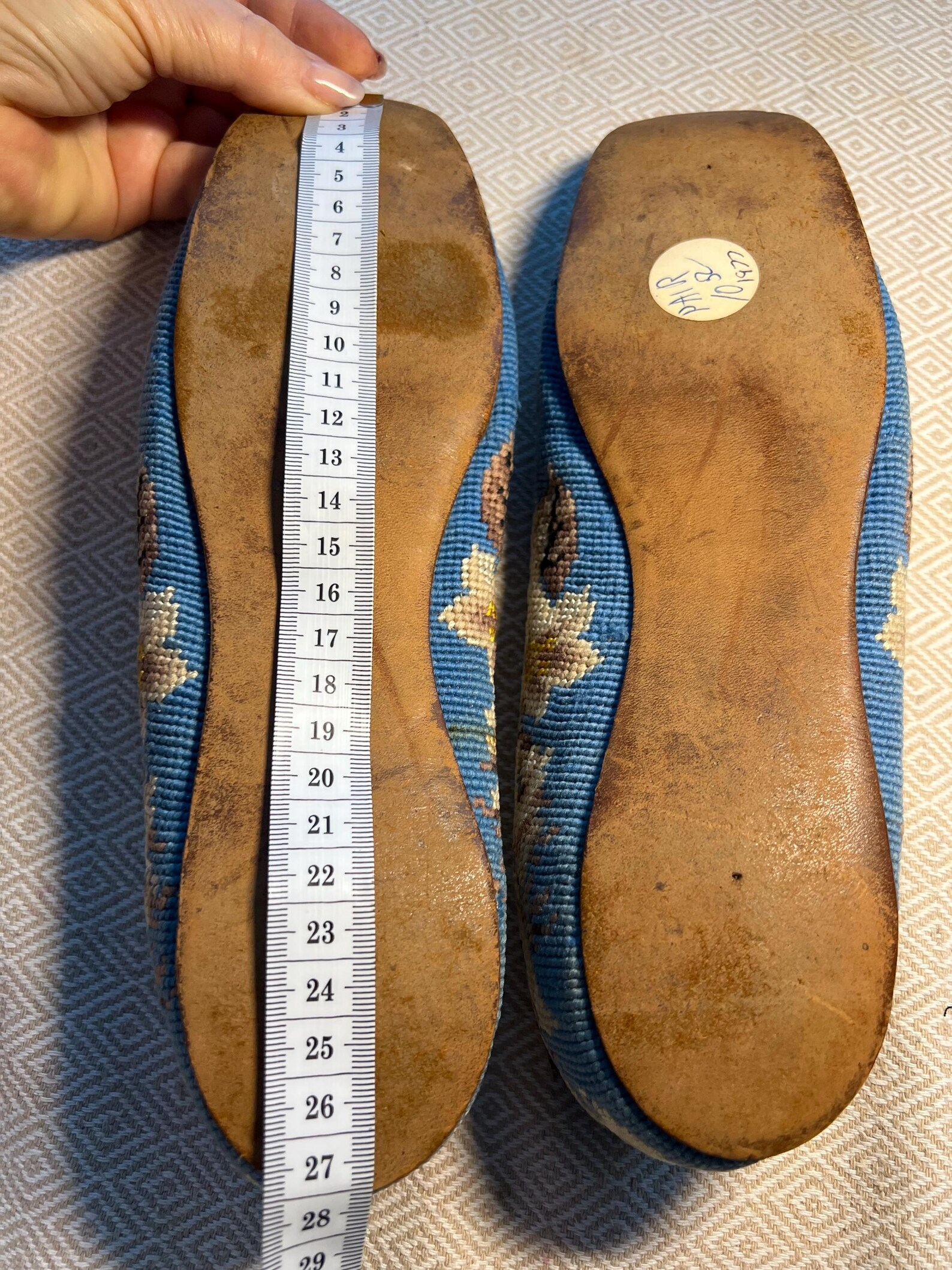 Beautiful embroidery on a blue background with white lilies and white callas. Embroidery on three sides. The inside is fine goat skin. The sole is made of thick, genuine brown leather. The sole is 10.6 inches or 27 cm long. Note the sole is for one foot; this was done until about 1900. When walking, the caps took the shape of the foot. The history of men’s embroidered house slippers dates back to ancient China, where shoes were decorated with symbols of power. Initially, they could be made of cotton or reed with a leather lining and had decorative elements. In the modern world, embroidery is just one of the decorative ways to give shoes a personal touch and make them an excellent gift, while the design and style themselves depend on current fashion trends.