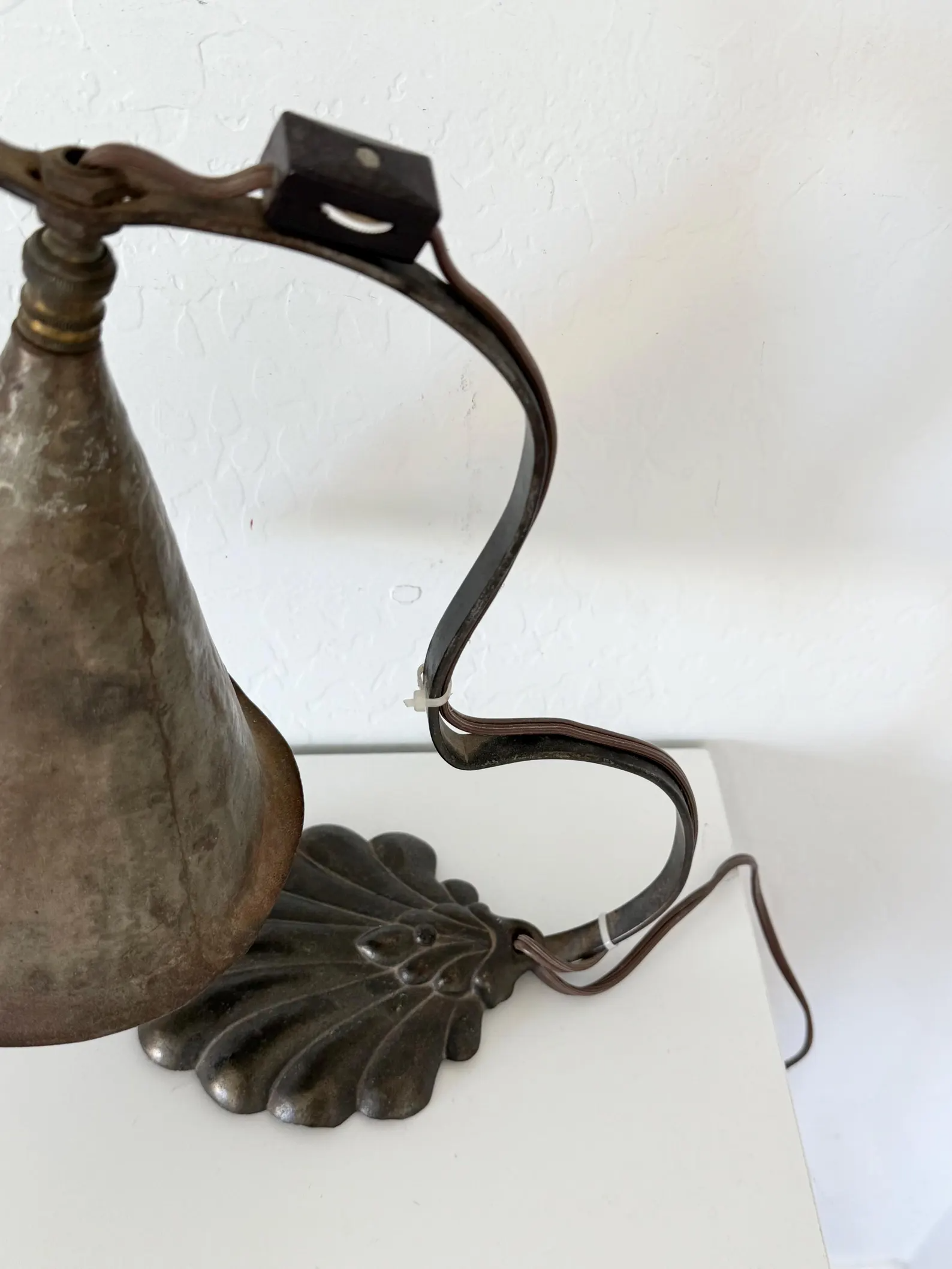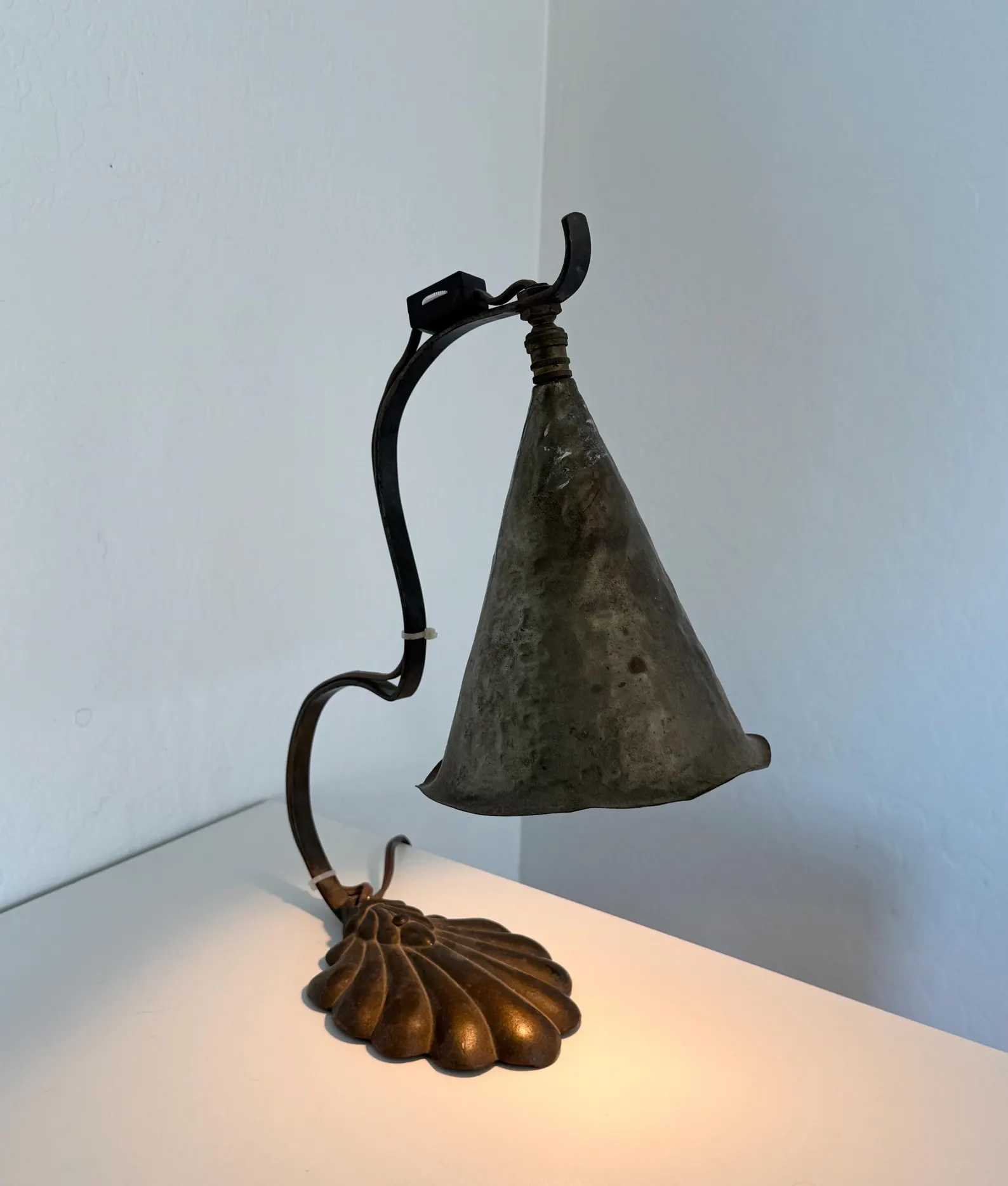 Early 20th century hammered forged iron lamp. The lamp shade is a conical hammered iron with natural organic curves, accompanying the shade is a shell-form cast base (a common motif in early ironwork). The lamp has the original wiring, tested and working, bulb not included.
