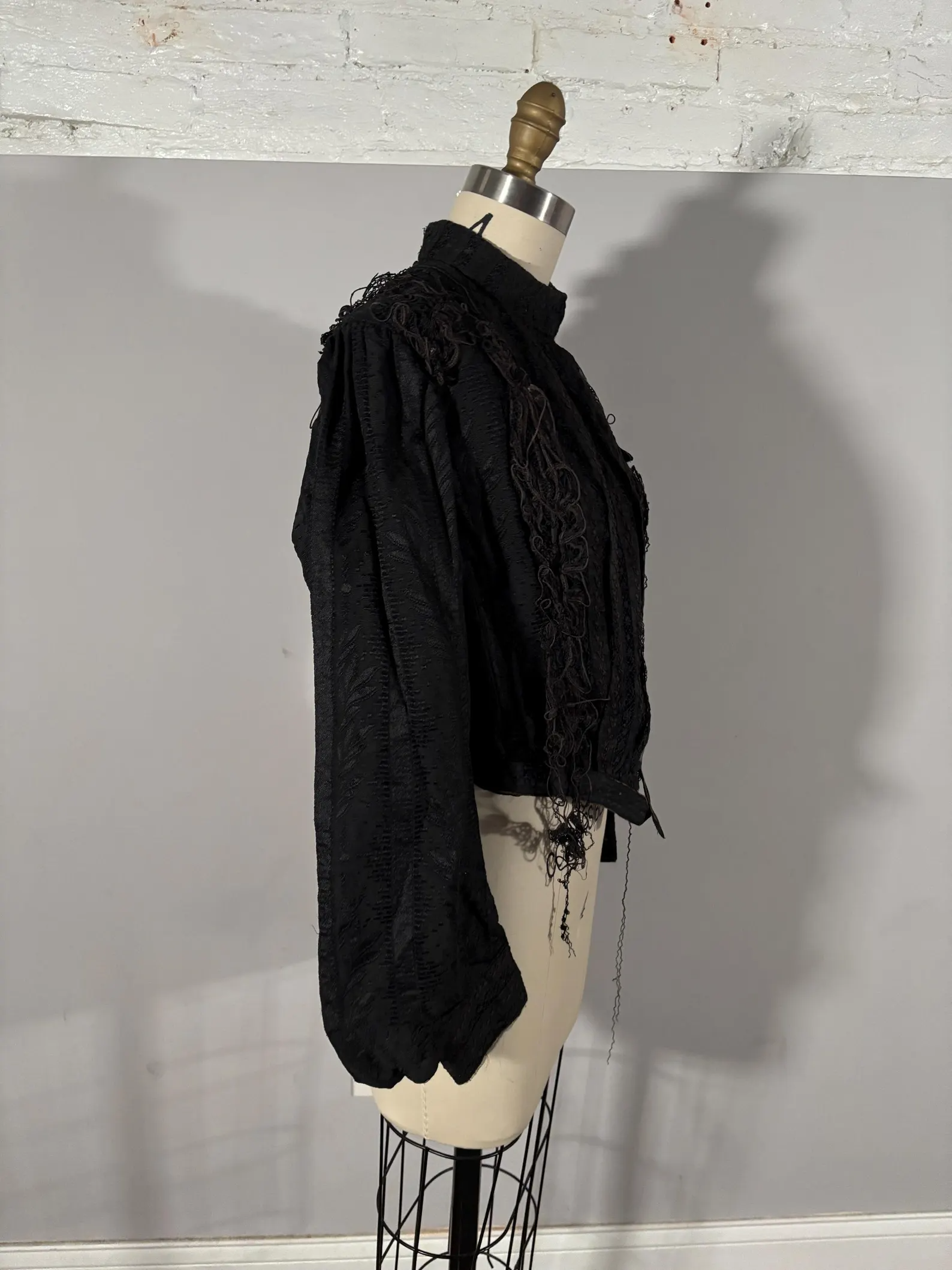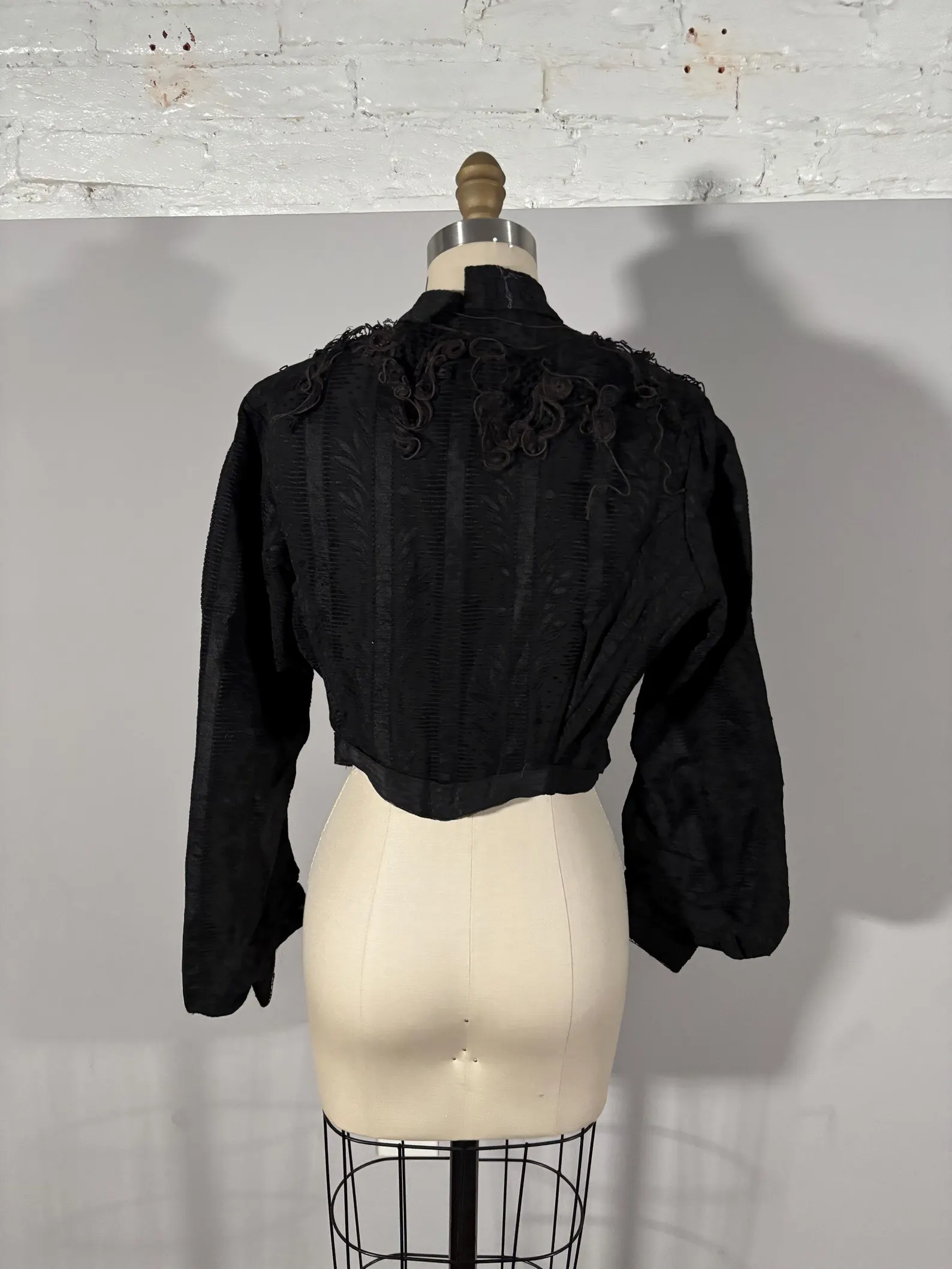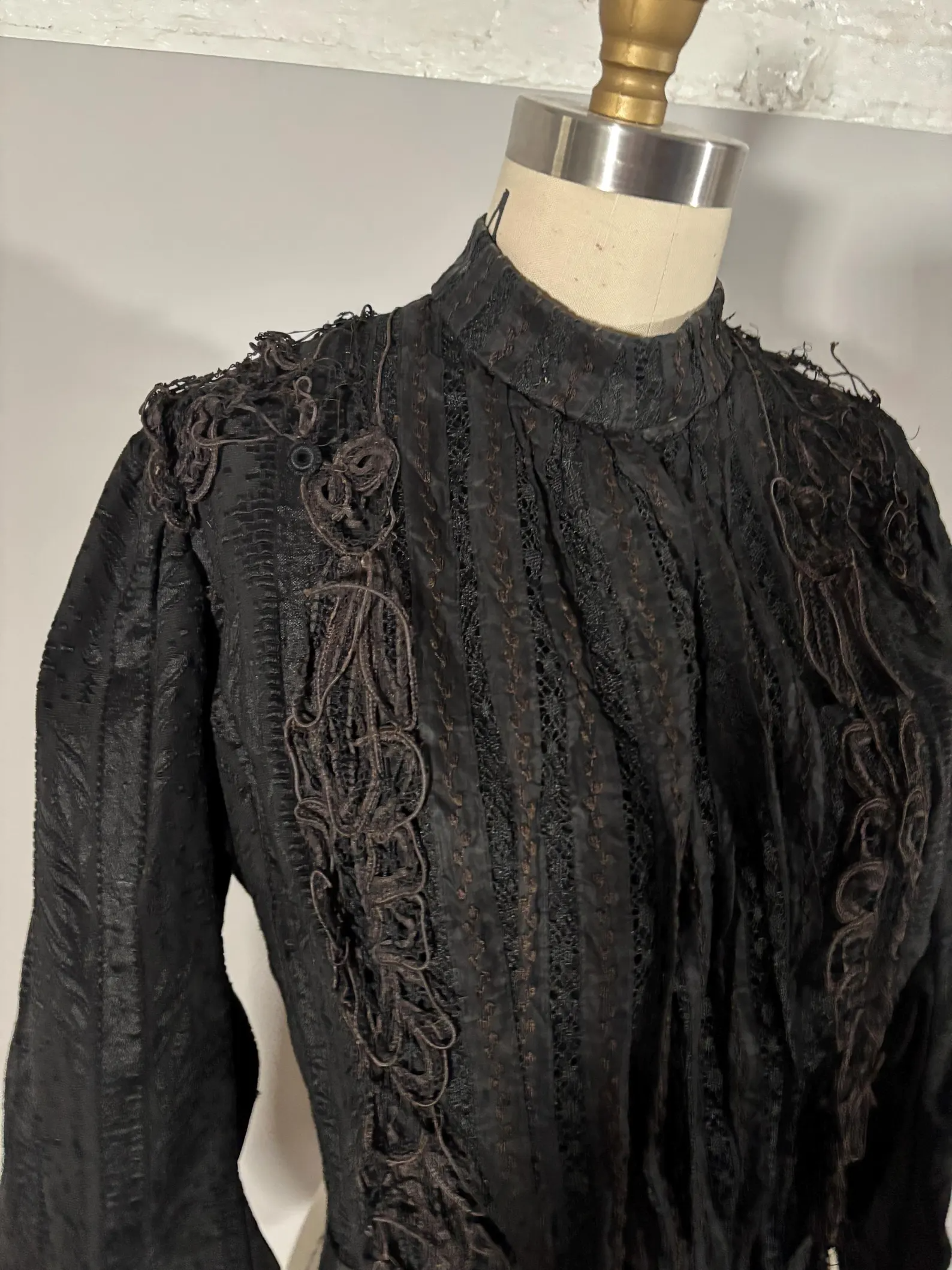 The bodice is in okay condition. The base fabric is holding up well and does not show signs of shattering. The lace is very damaged and is partially detaching from the base fabric- truly just quite a mess. The interior of the bodice has white accretions from the neck to the applied belt. It would be best for study or display. Not recommended for wear.