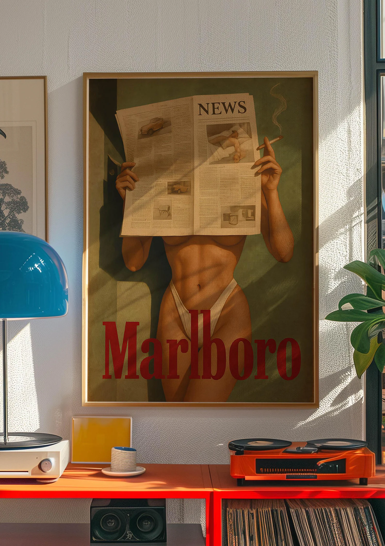 Inspired by vintage advertising and classic Americana, this bold artwork blends nostalgic charm with a provocative edge. Featuring a striking figure reading the NEWS while holding a cigarette, this piece brings retro glamour and edgy style into your decor.